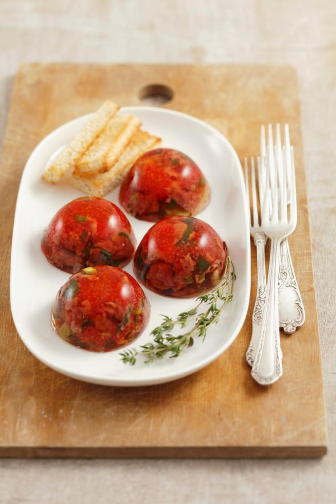 Sveže pečurke, šampinjone operite i očistite, tako da im ostanu samo kapice. Zagrejte vodu i dodajte u nju malo soli. Kada voda provri, spustite očišćene pečurke i ostavite ih da viruckaju na umerenoj vatri oko 10 minuta. U međuvremenu očistite praziluk i šargarepu i isecite ih na kolutove. Zatim razmutite želatin u litri vode, prema uputstvu sa pakovanja. Potom iseckajte sitno peršunov list i beli luk, pa dodajte u razmućen želatin.