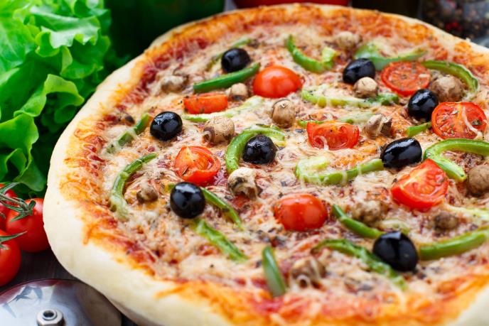 Priprema: Testo kružno razvući i namazati uljem, zatim premazati kečapom, pa ređati na kolutove isečen paradajz, prstenasto isečen crni luk i zelenu papriku, isitnjen beli luk, iseckane začine i pečurke iseckane na tanke listiće. Može se dodati i sir od soje. Po želji sve to na kraju preliti sa malo ulja.