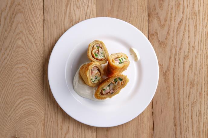 2. Smesu dobro promešajte viljuškom, pa podelite na 8 jednakih delova, odnosno trougla. Svaki deo stavite na palačinku, pa je zamotajte. Zamotane palačinke zatim panirajte u jajima i prezli.
