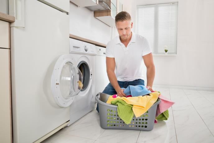 Muškarac sedi pored veš mašine i ubacuje veš u nju