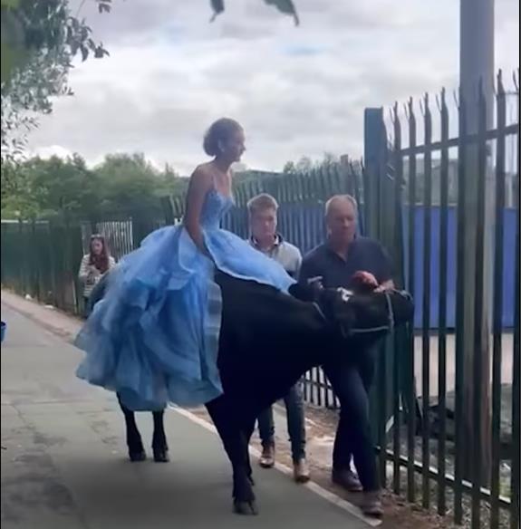 Maturantkinja Kloe došla je na kravi Oazis u pratnji svog oca Ričarda (43) i brata Tomasa (19). Devojka je krenula stopama svog starijeg brata, koji je na školsku maturu 2022. godine otišao u ogromnom žutom traktoru.