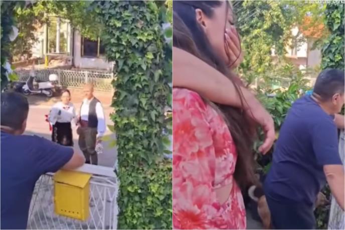 Trubači zasviraju, a emocije eksplodiraju – suze, smeh, zagrljaji. Devojka je vidno iznenađena, a atmosfera u dvorištu postaje pravi praznik duše.