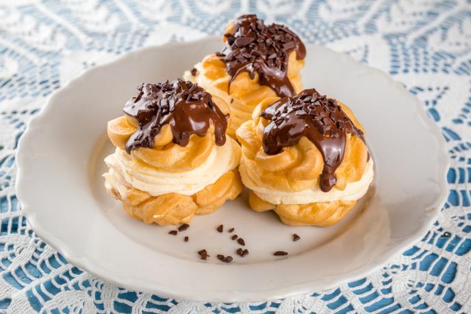 Zagrejte rernu na 220 stepeni i obložite tepsiju pek-papirom. Testo oblikujte špricem kružnim pokretima po pek-papiru, tako da napravite krofnice (počnite od sredine, pa širite krug i završite uvis). Pecite najmanje 20 minuta ili dok ne porumene, bez otvaranja rerne do samog kraja, kako ne bi splasnule. Izvadite i ostavite da se hladi.