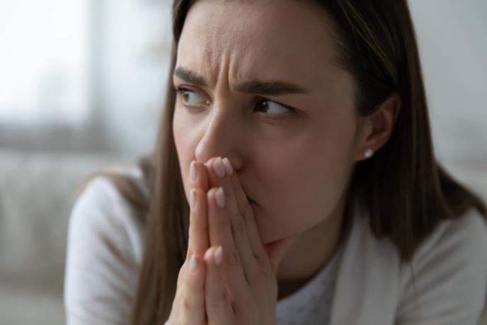 žena koja pati sedi na kauču sa zagrljenim jastukom