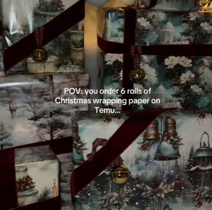 Prednja strana poklona izgledala je savršeno – ukrašena motivima irvasa, zvončića i zimskih pejzaža. Uz snimak je napisala: "POV: Naručite šest rolni božićnog ukrasnog papira sa Temua..."