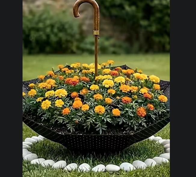 Zahvaljujući svom obliku, kišobran predstavlja savršenu osnovu za kreativne projekte u bašti. Kada se pravilno postavi ili malo prilagodi, pretvara se u elegantnu „korpu“ za biljke.