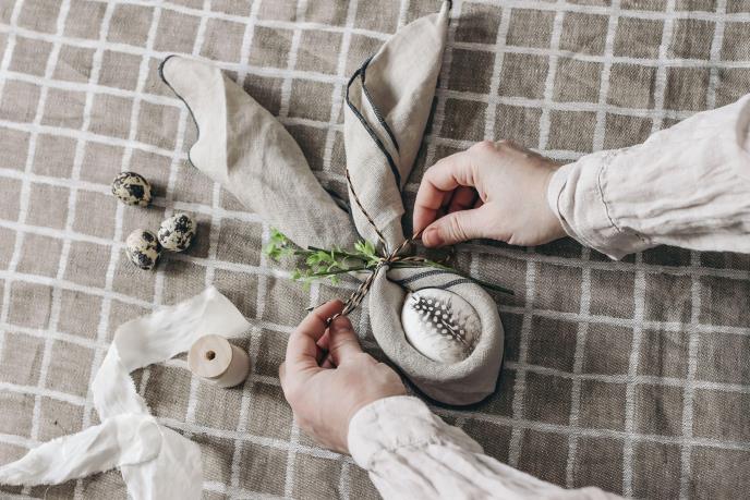 Krajeve salvete oblikujte po želji - možete ih podići i formirati u obliku cveta ili mašne. Zatim sve učvrstite kanapom, trakicom ili gumicom kako bi dekoracija ostala na mestu. Na ovaj način dobijate simpatičan i nežan ukras koji podseća na zeca ili cvet, u zavisnosti od toga kako oblikujete salvetu.