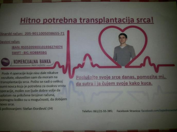 LEBAANE - Stefanu Đorđeviću (24) iz Lebana, potrebna je novčana pomoć kako bi otišao na transplantaciju srca, bez koje nema šanse da se izbori za život.