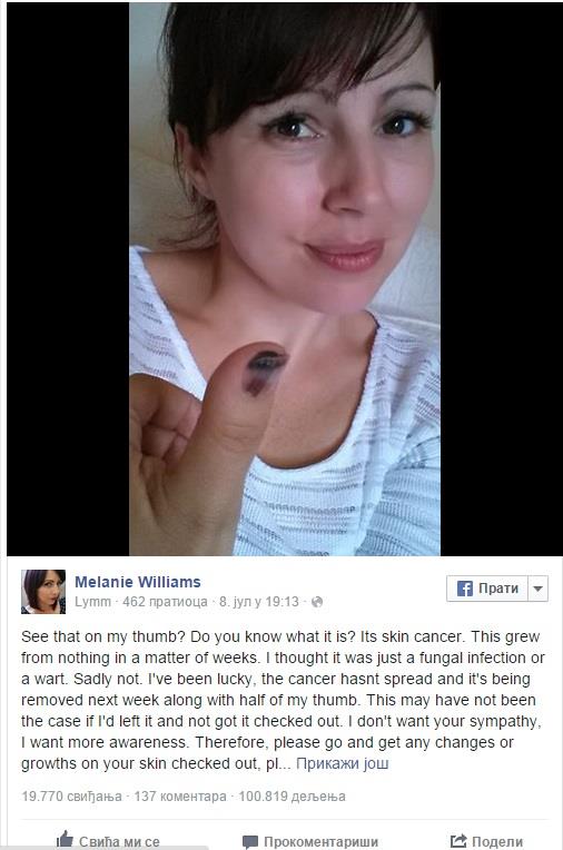 "Vidite li to na mom palcu. Znate li šta je to. To je rak kože. Možda ne bih bila u problemu da sam odmah otišla kod lekara. Ne želim vaše sažaljenje, želim da vam promenim svest. Molim vas proverite sve izrasline na koži i recite ljudima oko sebe da ih kontrolišu. Ne prepuštajte ih slučaju", napisala je ona.
