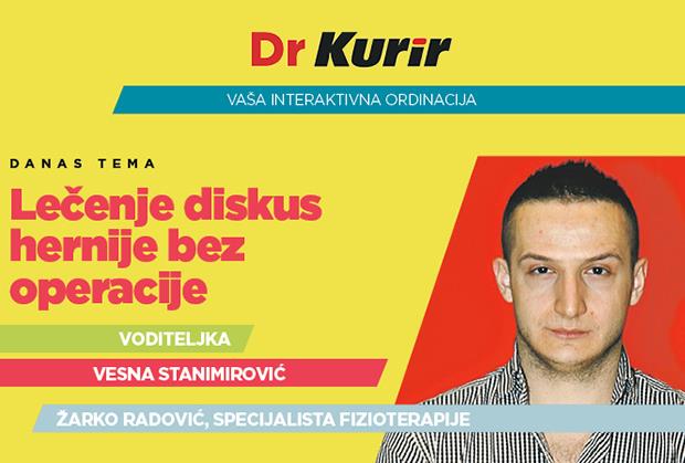 Više o diskus herniji, tegobama koje ona izaziva, kao i o najefikasnijem sistemu lečenja u današnjoj emisiji Dr Kurir govoriće dr Žarko Radović, specijalista fizioterapije. Dr Radović će biti na raspolaganju da odgovori i na sva vaša pitanja.