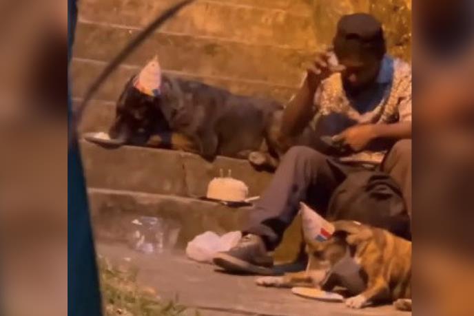 Emotivna slika čoveka nije nikoga ostavila ravnodušnim a u snimku se vidi kako grli pse kojima je na glavu stavio rođendanske kapice i koji su mu, kako se čini i najveća podrška i društvo koje mu je u tom trenutku bilo i više nego potrebno. Dok su prolaznici prolazili pored njega i pasa, on je sam sebi aplaudirao i pevao rođendansku pesmu gledajući svoje ljubimce a onda je na kraju i dunuo i ugasio svećice na torti.