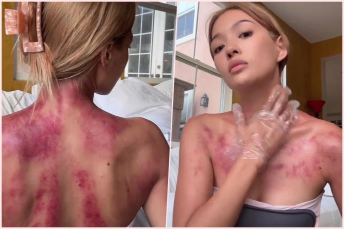 Na snimku se njen vrat, ramena i grudi mogu videti prekriveni crvenim mrljama - što dovodi do zabrinutosti na internetu da je oštetila kožu.