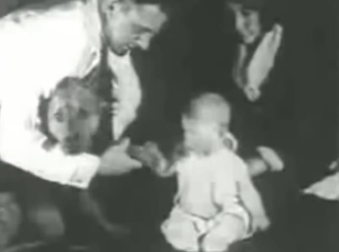 Snimak psihološkog eksperimenta „Mali Albert“ iz 1920. godine u kojem je beba uslovljavana da se plaši belog pacova (5).png